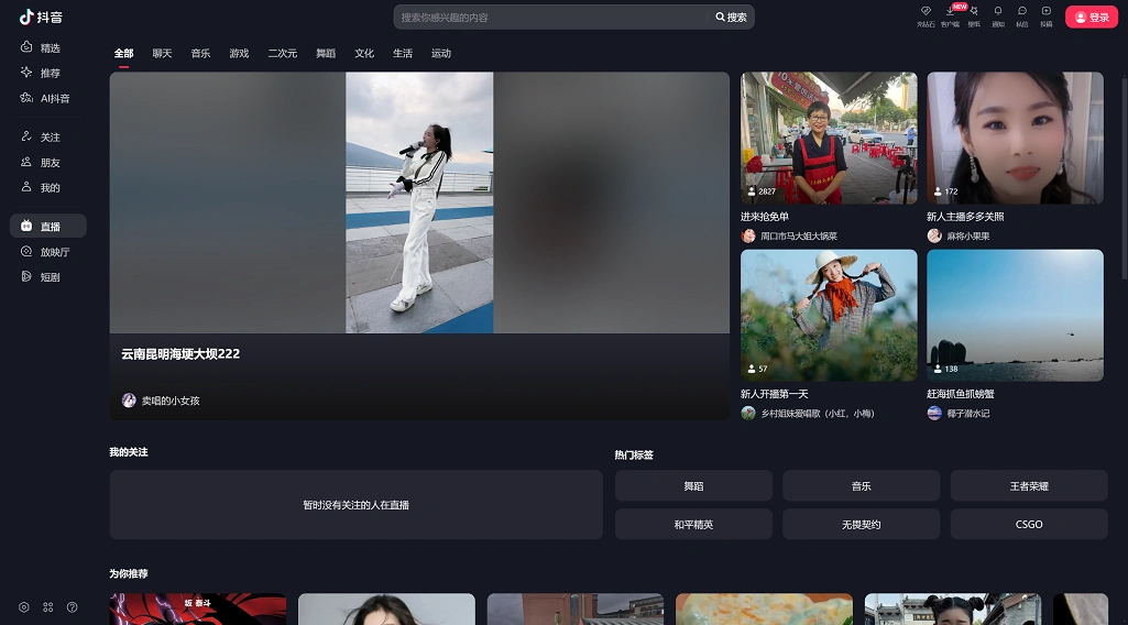 - 关注/朋友机制:若用户通过抖音账号登录,可看到“我的关注”“朋友”直播。网页版首页也提及 “我的关注 暂无关注的人在直播” 的提示。