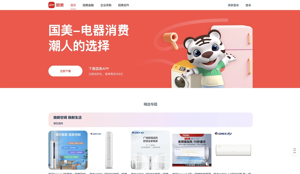 国美电器/国美零售是国内大型家电与数码电器零售企业集团,创建于 1987 年。官网隶属于其电商平台,即其线上零售渠道之一。官网自我定位为“集团唯一官方综合网购商城”。官网不仅是购物平台,还整合了品牌直销、手机端 APP、线下门店支持、全国配送、售后服务等。