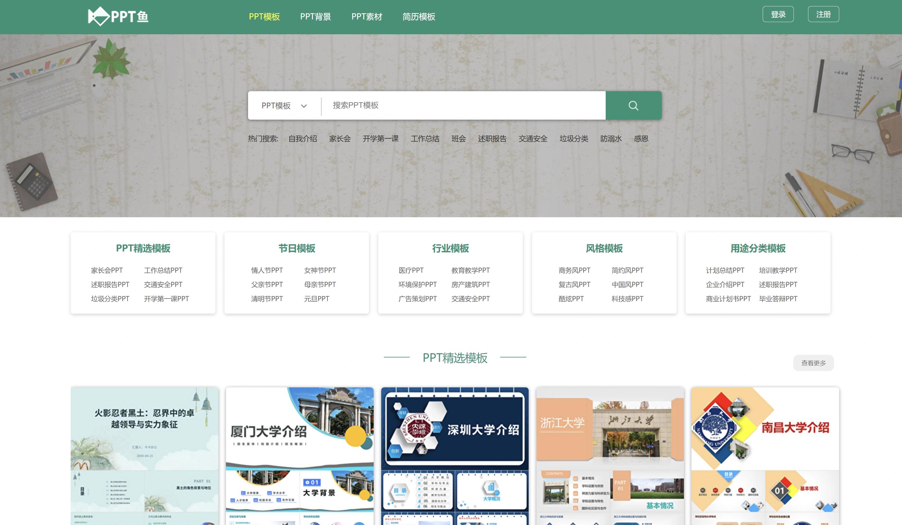 PPT鱼模板网(https://www.pptyu.com/)一个提供 大量中文 PPT 模板、背景与素材下载 的平台,覆盖教育、企业、节日、简历等多种场景。主打“海量资源+每日更新+会员无限下载”的服务模式。用户可以通过分类或标签快速查找所需模板,并可通过注册/登录后下载。