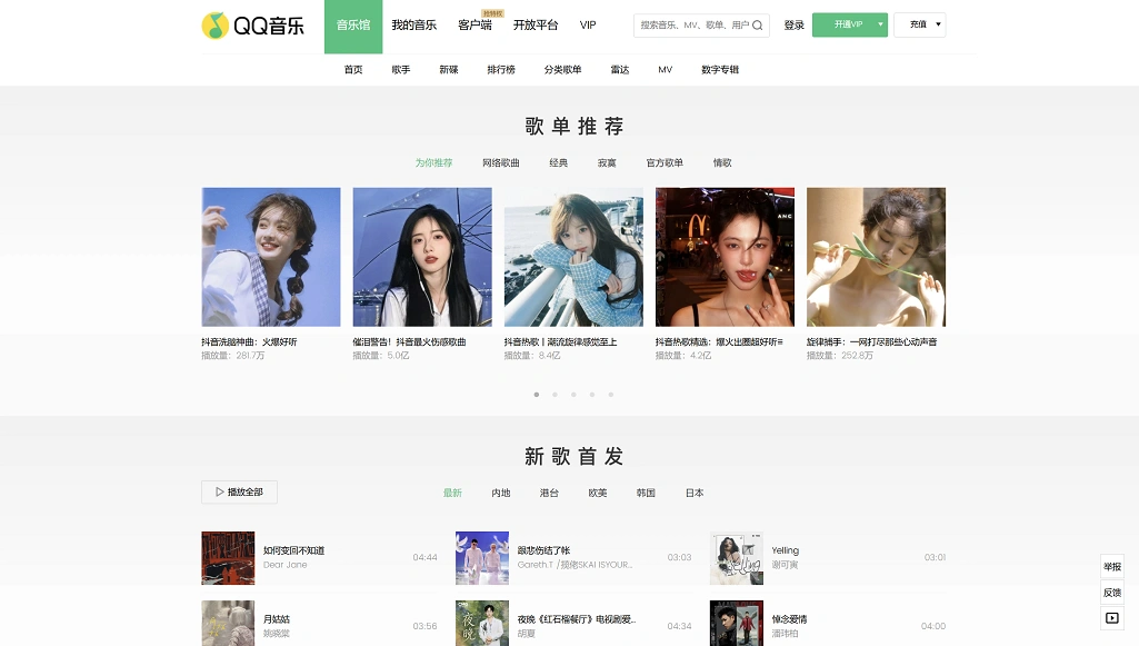 - 在线试听/歌曲库检索:用户可以通过首页、“音乐馆”、歌手、专辑、榜单、分类歌单等入口查找歌曲、播放试听。 官网首页即可见热门歌单、分类歌单、新歌首发等模块。