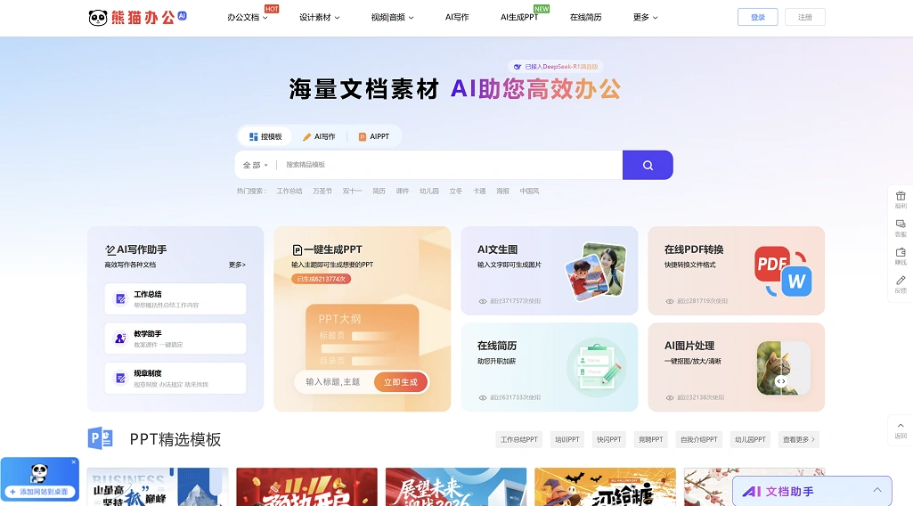 熊猫办公是一个定位为一站式办公模板与设计素材平台,面向个人/企业用户提供 PPT、Word、Excel 模板及多类设计素材与 AI 办公工具。