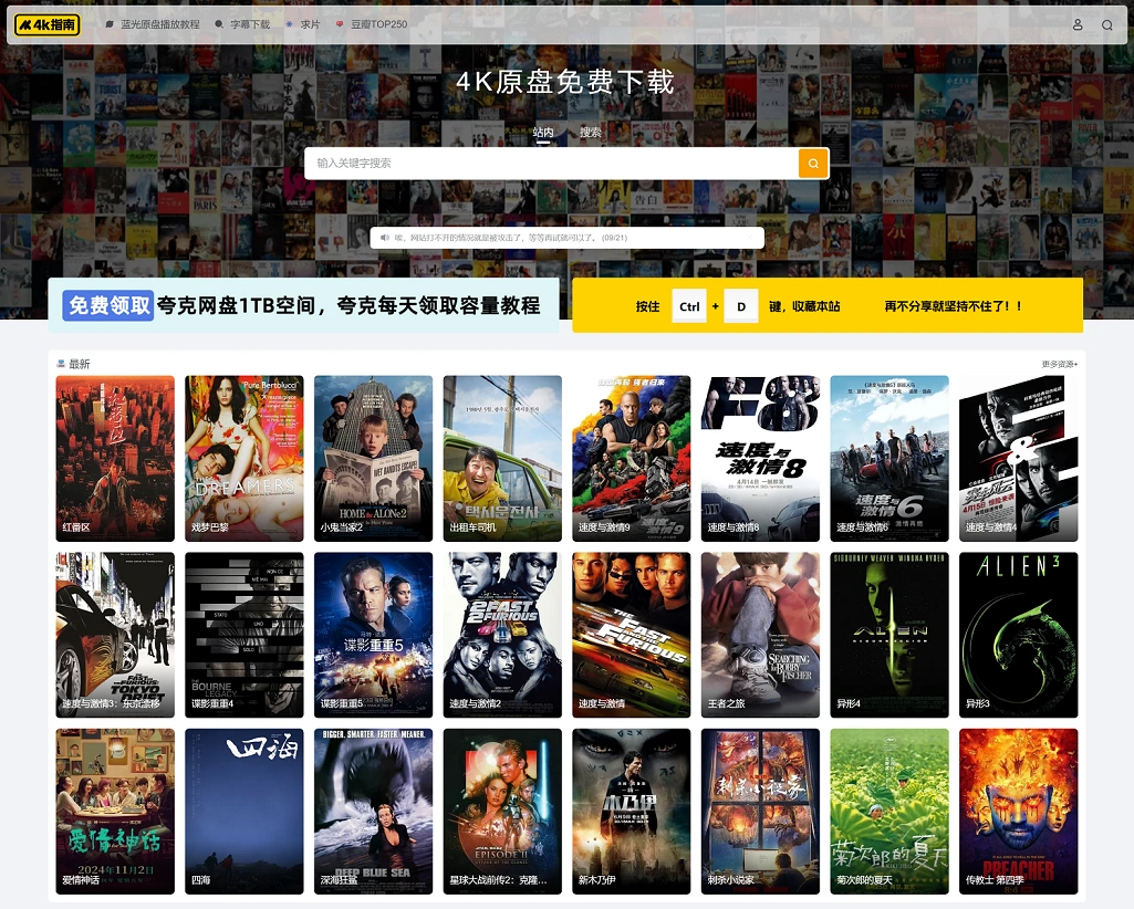 4K指南是一个面向影视爱好者的高画质资源分享站,界面和功能相对直观,提供多种类型的4K高清视频。